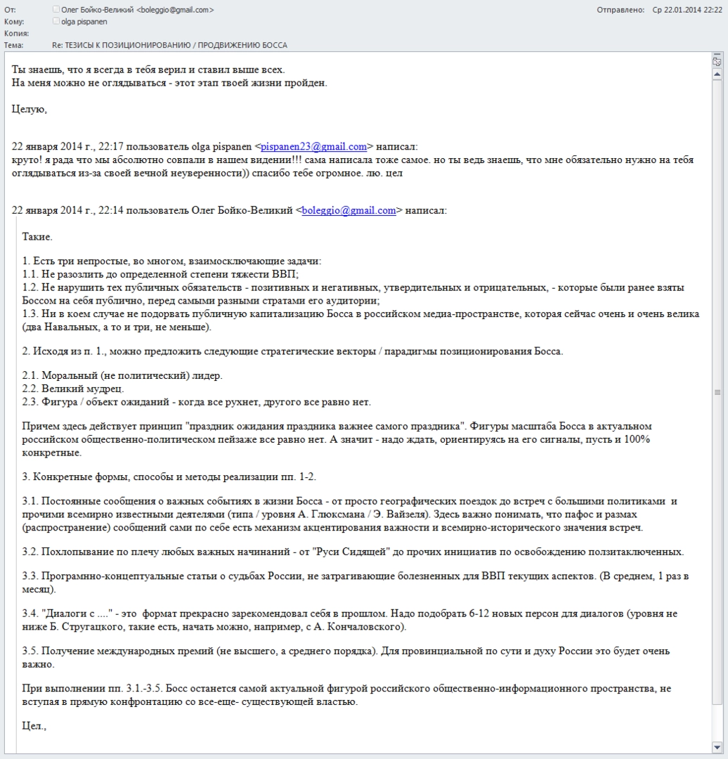 В письмах к Кюлле Писпанен Белковский, скрывающийся под звучным псевдонимом «Олег Бойко-Великий», советует Ходорковскому «не разозлить до определенной степени ВВП», и при этом не нарушить взятых на себя обязательств перед оппозиционно настроенной аудиторией.