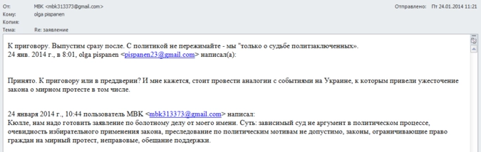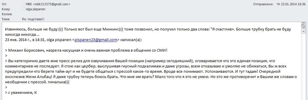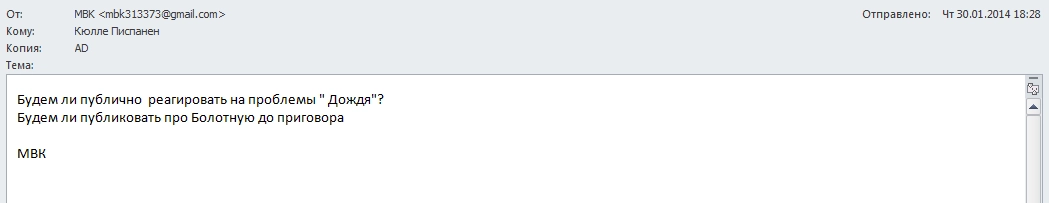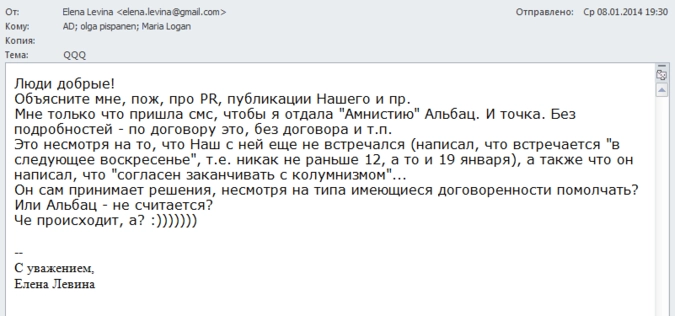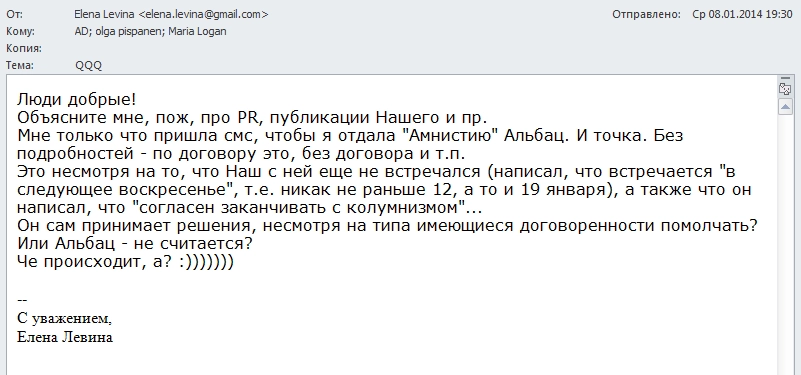 Среди прочих тем, затронутых пресс-атташе МБХ, любопытно обсуждение вопроса отдачи темы «Болотной амнистии» главреду «Нового времени» Евгении Альбац: