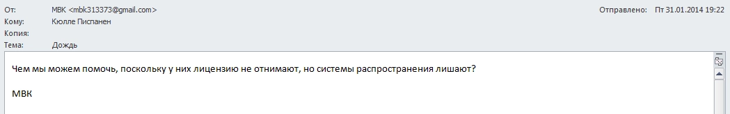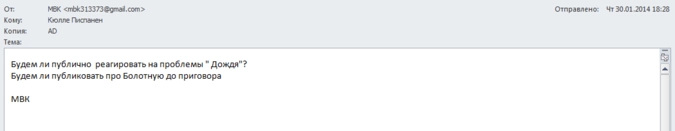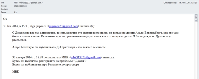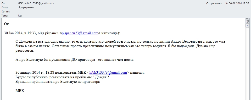 Удостоверившись в реальности происходящего, смело приглашаем читателей с головой погрузиться в «кроличью нору» запутанных связей штаба Ходорковского с лидерами протеста. Украинская хакерская группировка «Пятая власть» публикует продолжение переписки пресс-атташе МБХ. В главных ролях новой «серии» — «оптимистичный» телеканал «Дождь», Евгения Альбац и политтехнолог Станислав Белковский.