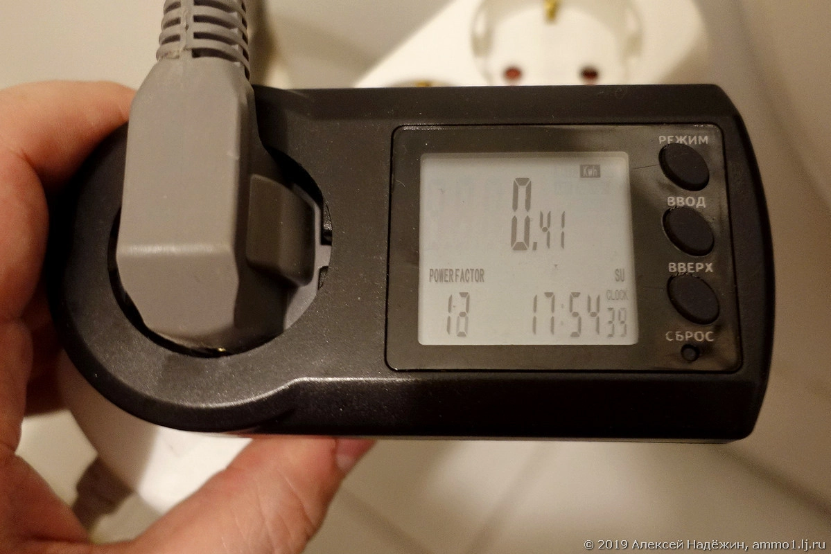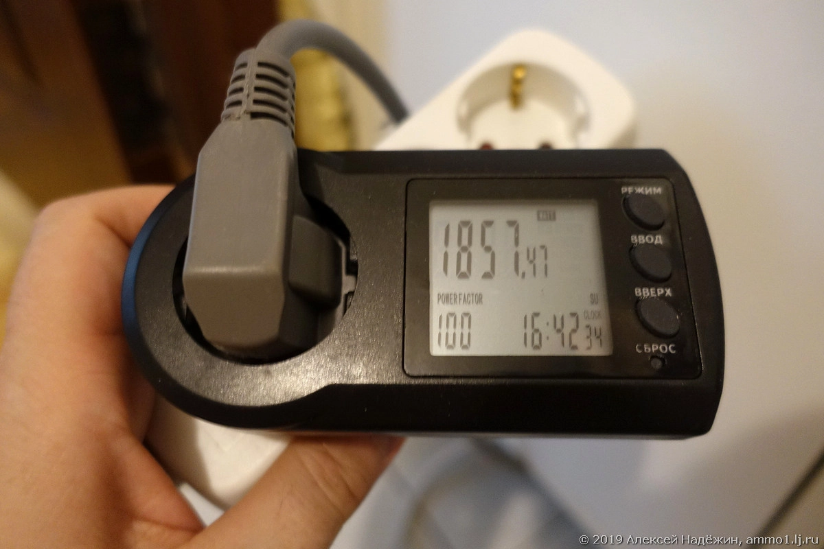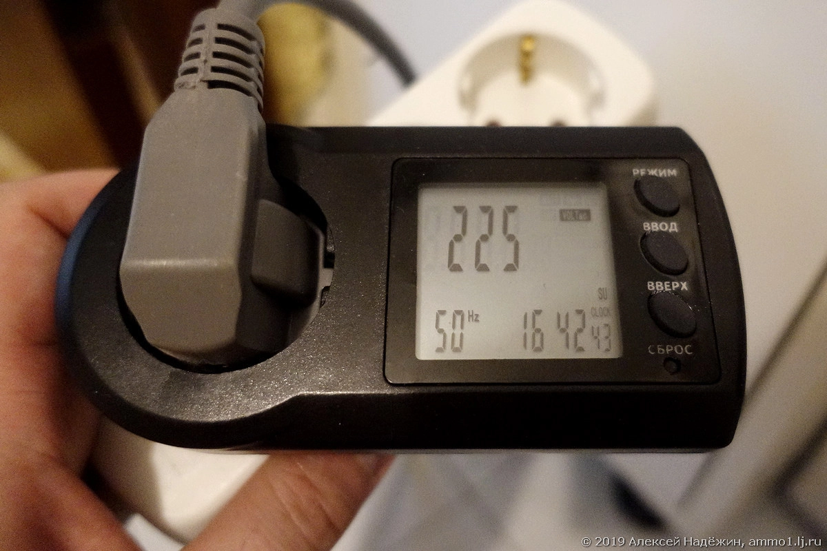 Для того, чтобы узнать, сколько потребляет машина, я воспользовался точным измерителем мощности Robiton PM-2. Напряжение в сети — 225 вольт.