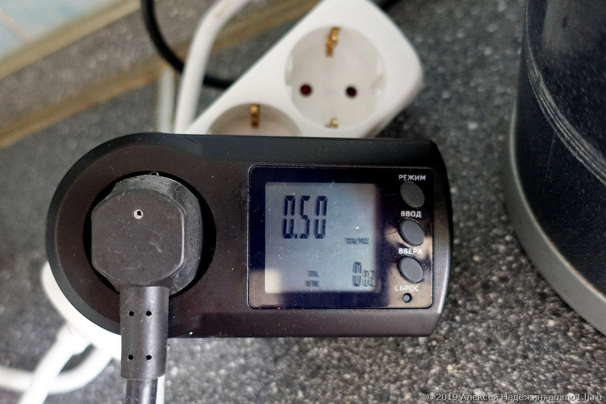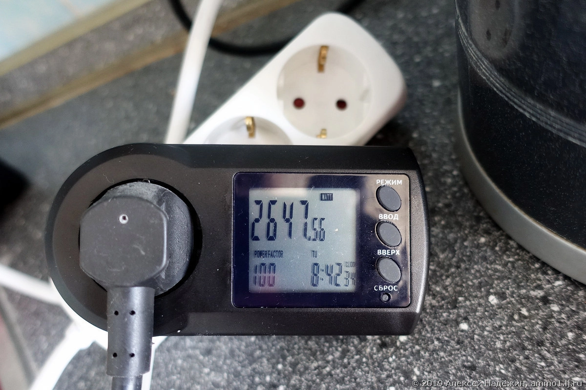 Для того чтобы узнать, сколько потребляет чайник, я воспользовался точным измерителем мощности Robiton PM-2.