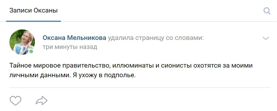 После этого Оксана Мельникова приняла решение «уйти в подполье». На данный момент ее страница недоступна.