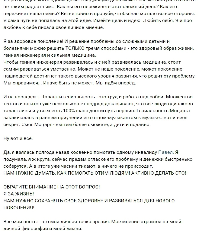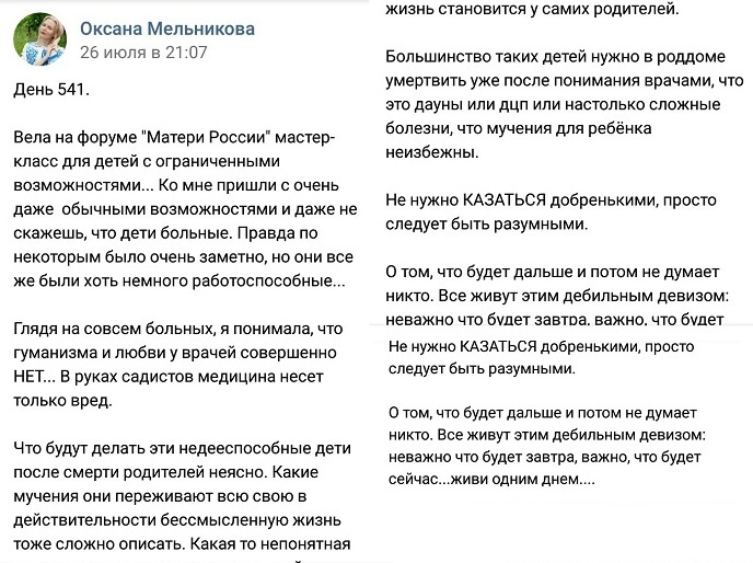Этот пост был опубликован на странице женщины 26 июля. В нем было сказано, что такие мысли к ней пришли, когда она вела на форуме «Матери России» мастер-классы для детей с ограниченными возможностями здоровья.