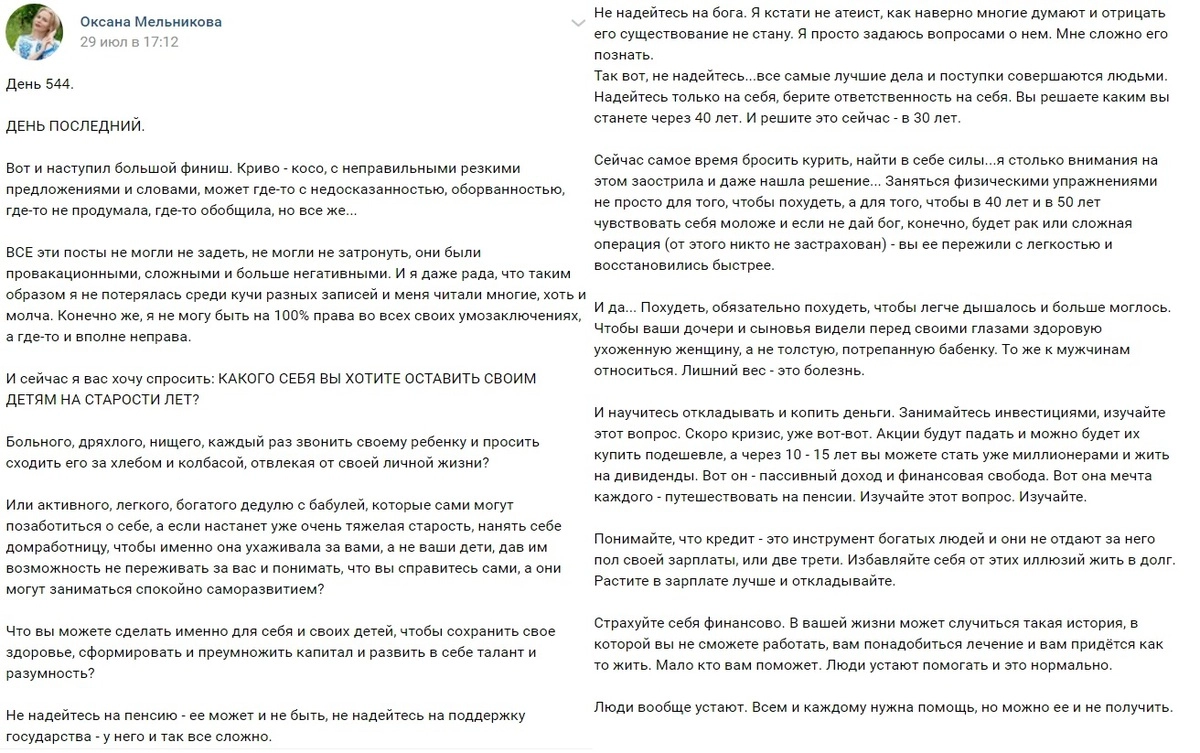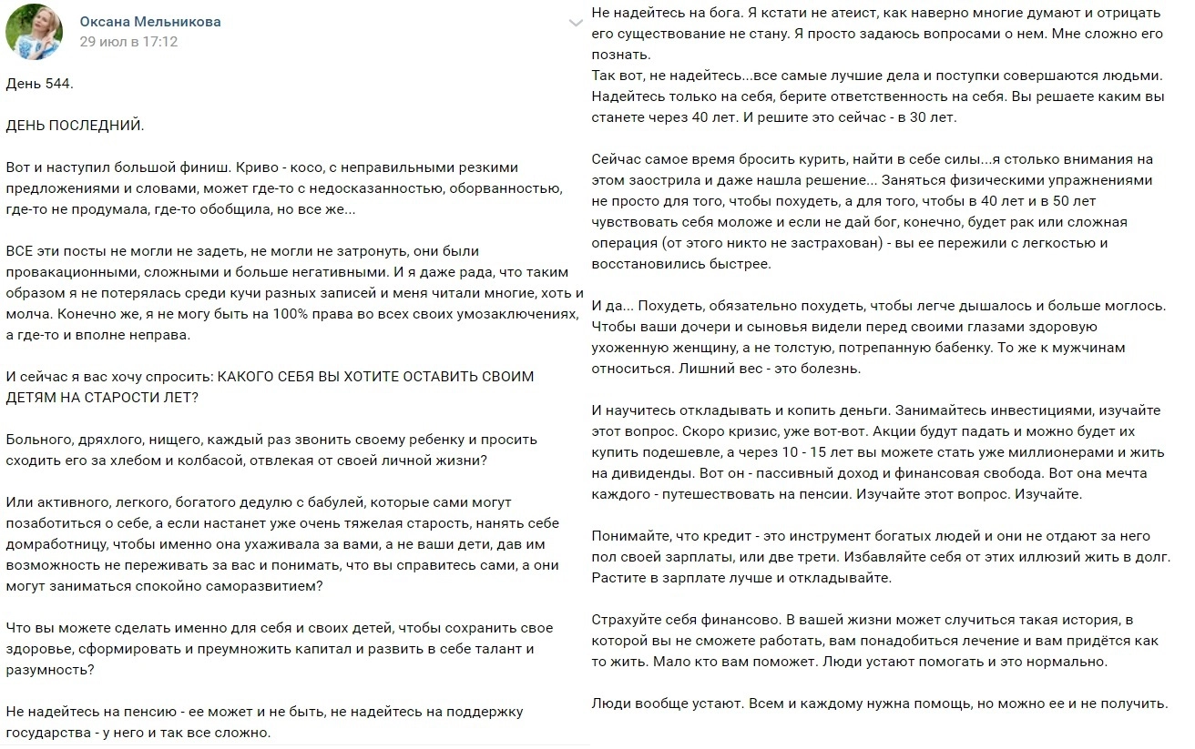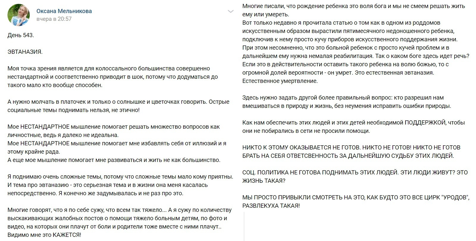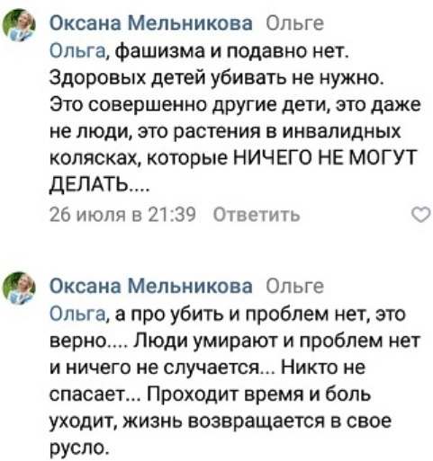 В настоящее время эти посты удалены. Оксана Мельникова выложила третий пост с новыми рассуждениями, в котором признала, что не может быть стопроцентно во всем права, а может быть, она и неправа.