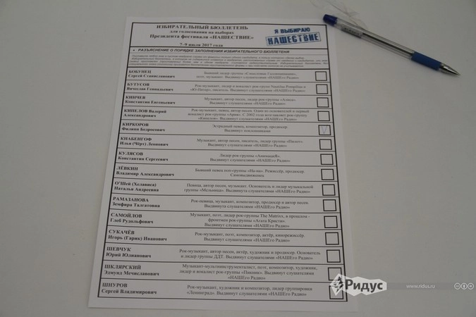 Избирательный участок у нас один. Здесь работают волонтеры ЦИКа, ВШЭ, МГУ. Люди подходили, задавали вопросы и хотели проголосовать с девяти часов утра, однако участок открылся в полдень. А с завтрашнего дня он будет работать с 11 до 20 вечера. Процедура голосования очень проста: любой человек может зайти на участок, предъявить идентификатор (это браслет, входной билет или паспорт), затем ему на браслете ставят специальную метку, чтобы исключить возможность повторного голосования, дают бюллетень, человек проходит в специальное место и голосует. Я уже проголосовал за своего любимого музыканта, надеюсь он победит и станет президентом «Нашествия», рассказал «Ридусу» главный редактор НСН и медиадиректор фестиваля Сергей Горбачев.