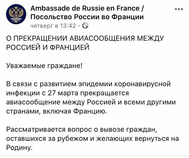Из 7—8 поездов разной цены и скорости, из которых был обычно выбор, в расписании остался только один быстрый TGV за 42 евро. К счастью, дома имелся принтер, распечатал все. На официальной странице посольства РФ во Франции появилось сообщение о закрытии с 27-го числа авиасообщения с заграницей