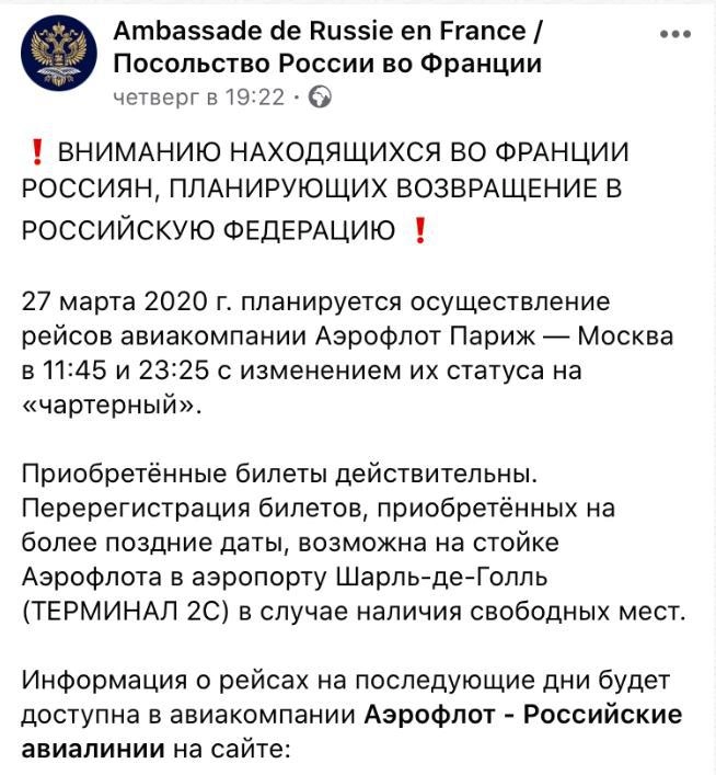 Также было опубликовано обращение с просьбой к гражданам РФ, нуждающимся в эвакуации, сообщить по электронной почте свои данные для составления списков. Я не стал паниковать, позвонил сначала на горячую линию посольства, потом во французский офис «Аэрофлота». Везде занято. Попросил друга позвонить из Москвы в московский «Аэрофлот», там подтвердили, что мой борт полетит, билет действителен.