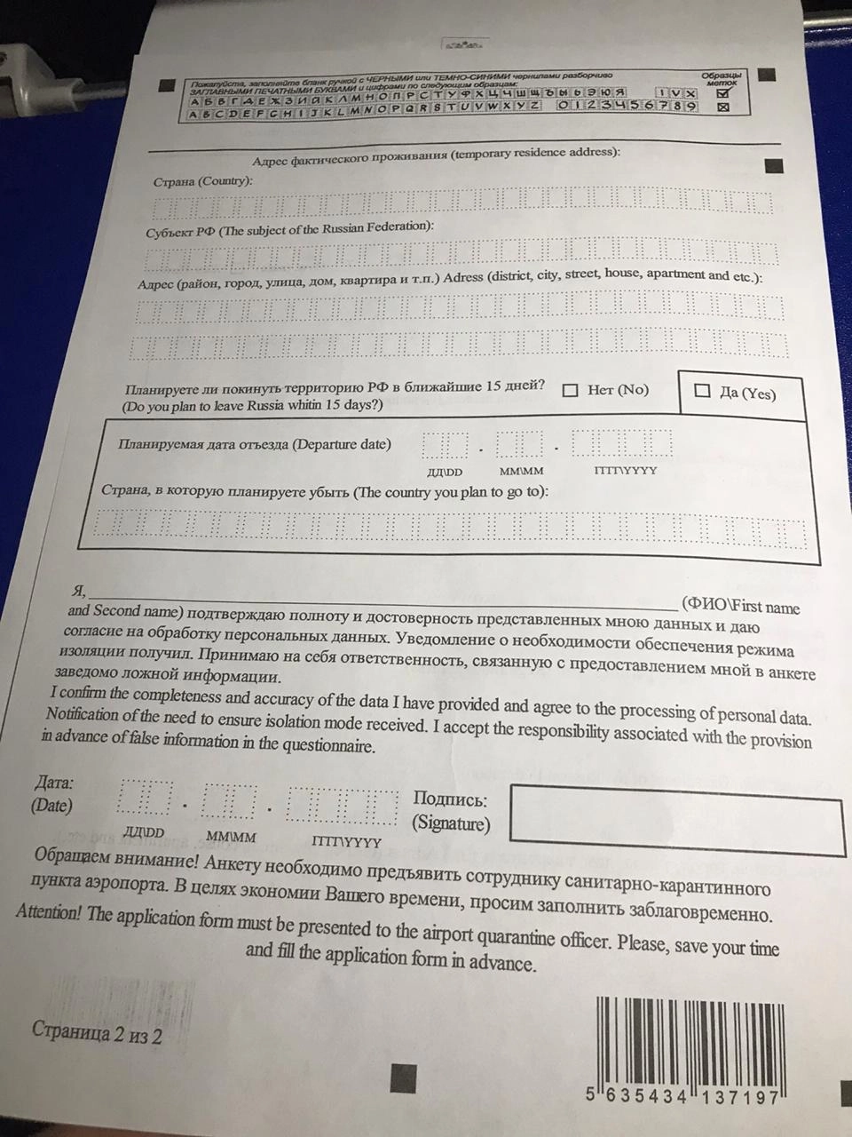 После долгой рулежки мы взлетели. Мне не спалось, дочитал книжку, за час до посадки всем раздали анкеты с вопросами о том, кто откуда, куда и где фактически собирается самоизолироваться.