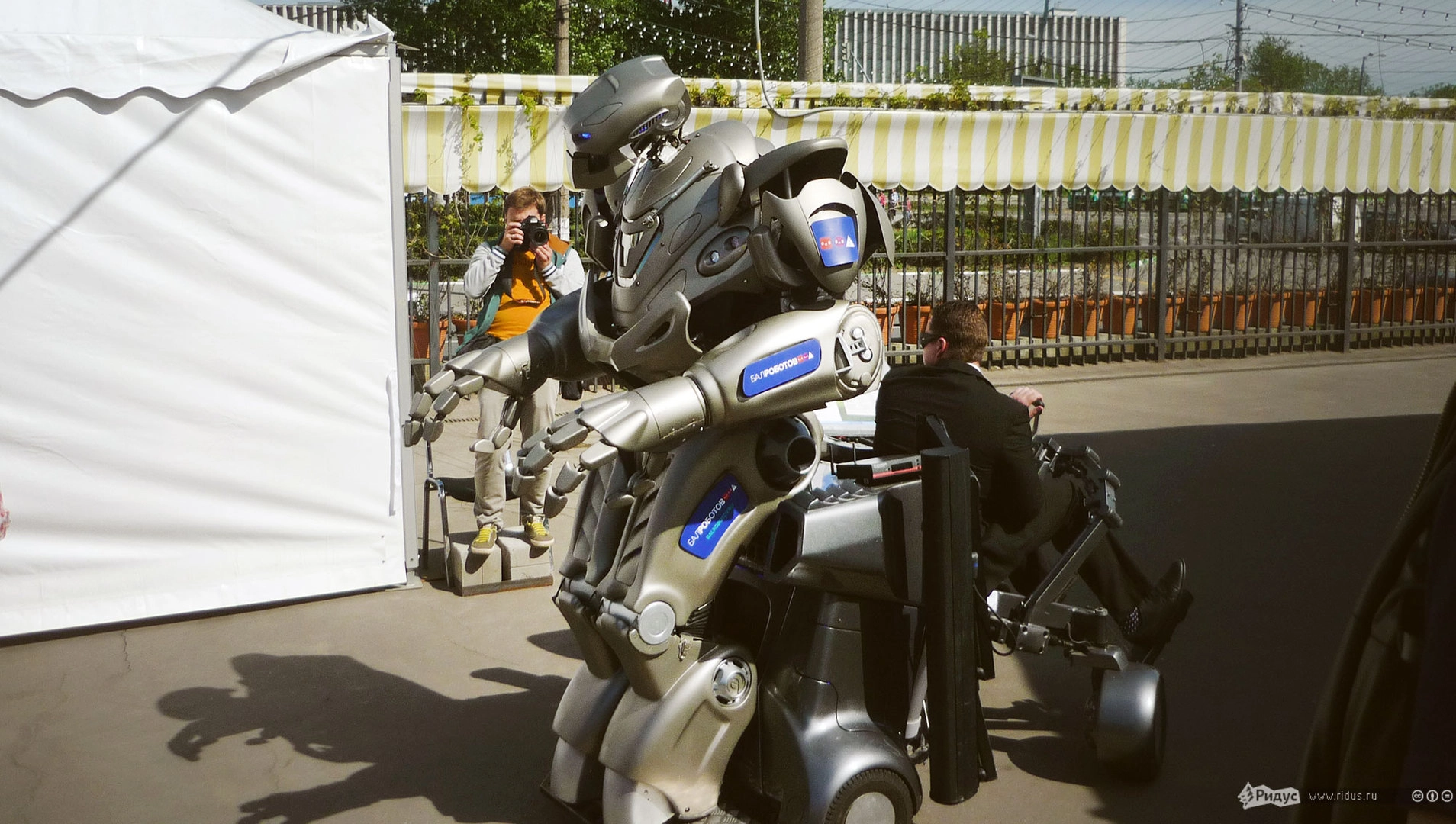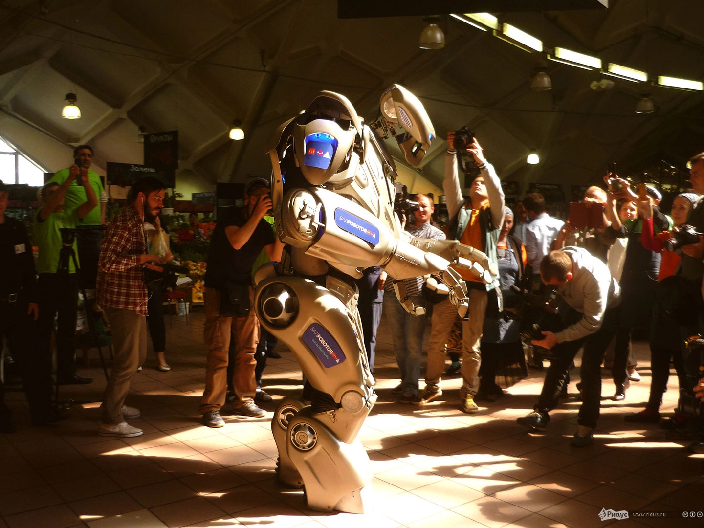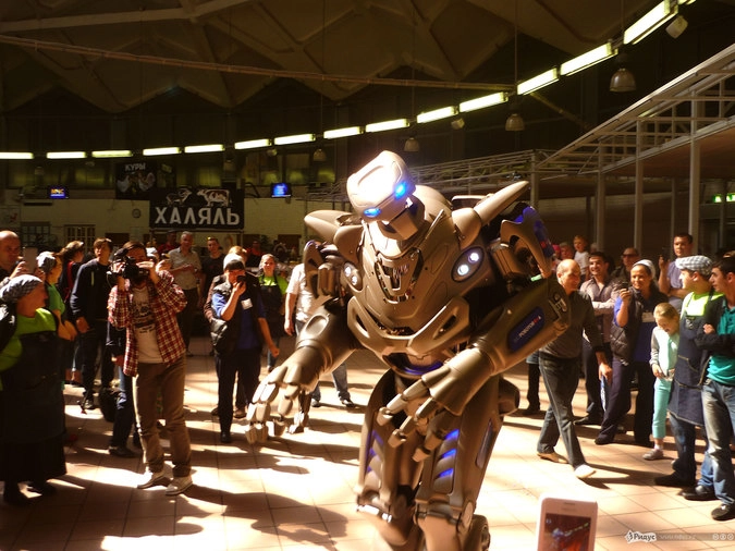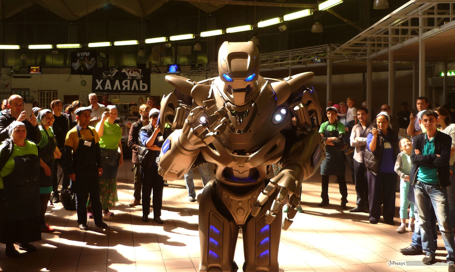 Вообще-то он выглядит довольно зловеще: размерами раза в два больше Николая Валуева, здоровенные ручищи крутятся во все стороны, при движении издает характерные для голливудских роботов звуки. В его облике есть что-то от Железного человека и машин из третьей части про Терминатора. Когда он въехал на специальном кресле-каталке в павильон рынка, в голове невольно всплыли кадры из фильма про Робокопа – там, где робот-конкурент главного героя взбесился и перестрелял всех вокруг. Впрочем, Титан в один миг рассеял все сомнения, покорив публику буквально за пару секунд.