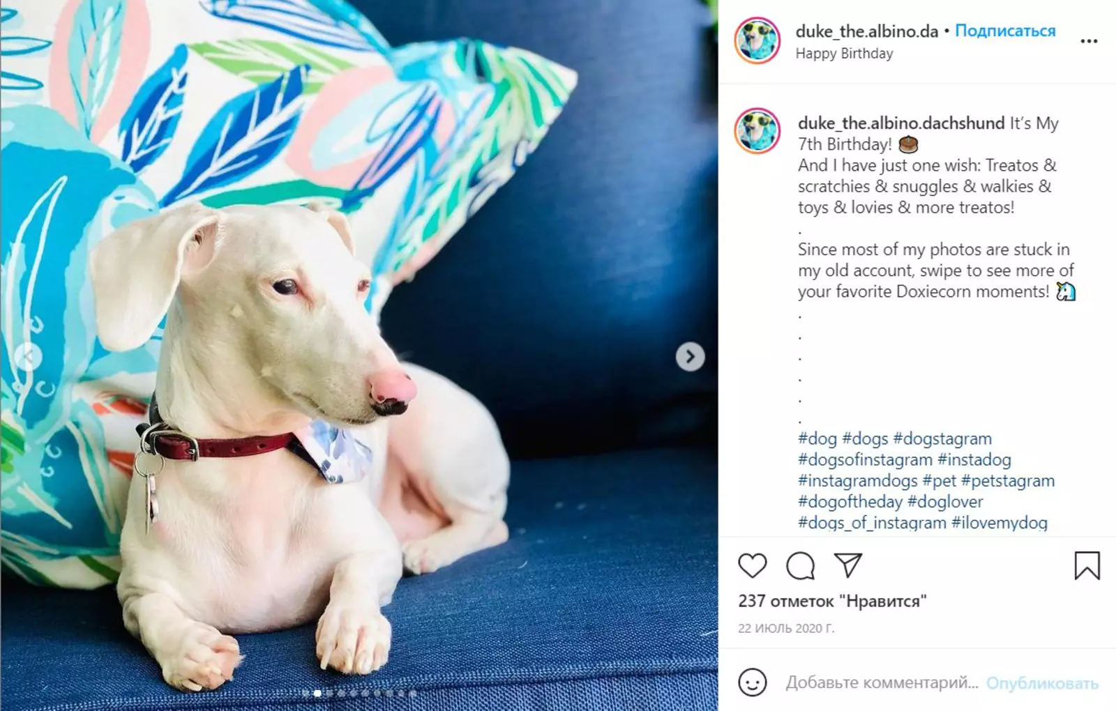 Герцог не похож ни на одну другую таксу, которая у меня была. Он очень любит играть со всеми своими игрушками, утренние и вечерние прогулки, и, к моему приятному удивлению, обожает наряжаться и фотографироваться, — поделилась Мерседес.