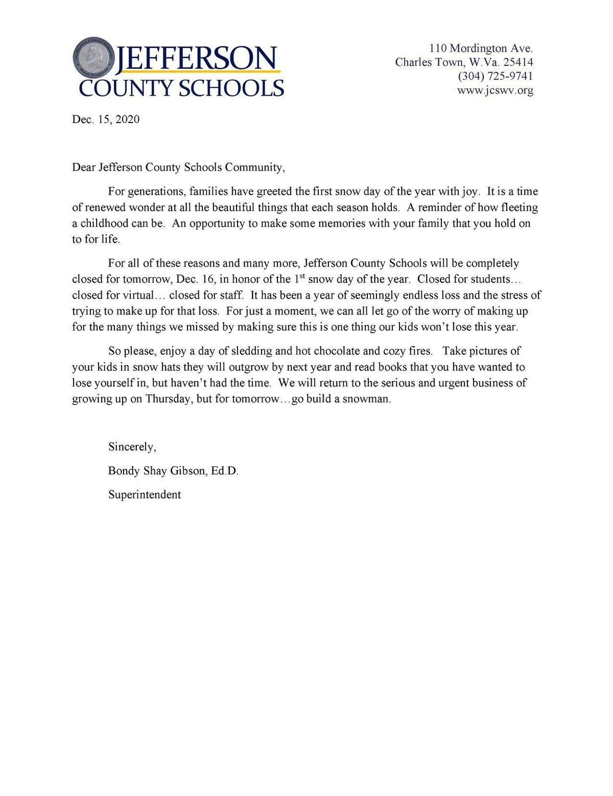 Из поколения в поколение семьи с радостью встречают первый снежный день в году. Это время восхищения всеми прекрасными вещами, которые есть в зимнем сезоне и напоминание о том, каким скоротечным может быть детство. Это возможность создать новые приятные воспоминания о своей семье, которые останутся с детьми на всю жизнь. У нас был год, казалось бы, бесконечных потерь и стресса от попыток восполнить эти потери. Теперь на мгновение мы все можем отпустить беспокойство об упущенных возможностях, убедившись, что дети не потеряют в этом году хотя бы что-то. Поэтому, наслаждайтесь днем катания на санках, горячего шоколада и уютных костров. Сфотографируйте своих детей в снежных шапках, которые они перерастут к следующему году, и прочитайте книги, которые мечтали прочесть, но у вас не было времени. Мы вернемся к серьёзным делам и взрослению в четверг. А завтра — идите и слепите снеговика, — говорилось в письме.