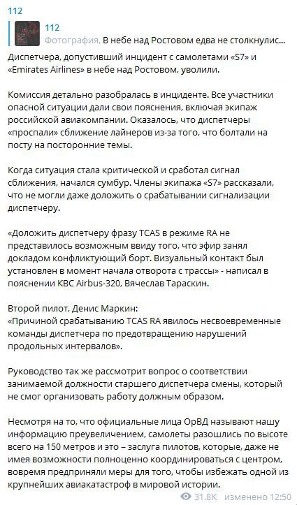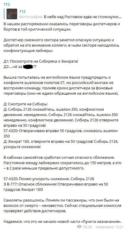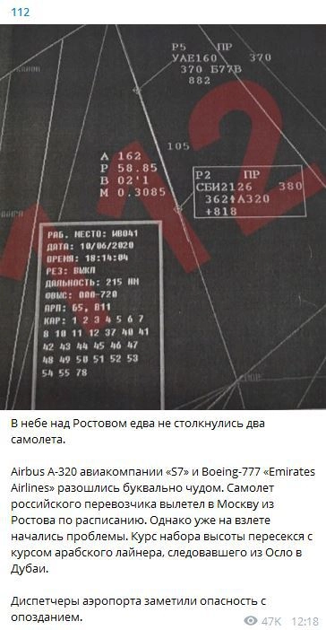 2 июля популярный Telegram-канал «112» сообщил, что в небе над Ростовом-на-Дону якобы едва не столкнулись два воздушных судна. Авторы каналы утверждали, что диспетчеры обнаружили опасность с опозданием, а в самый опасный момент самолеты находились всего в 150 метрах друг от друга.