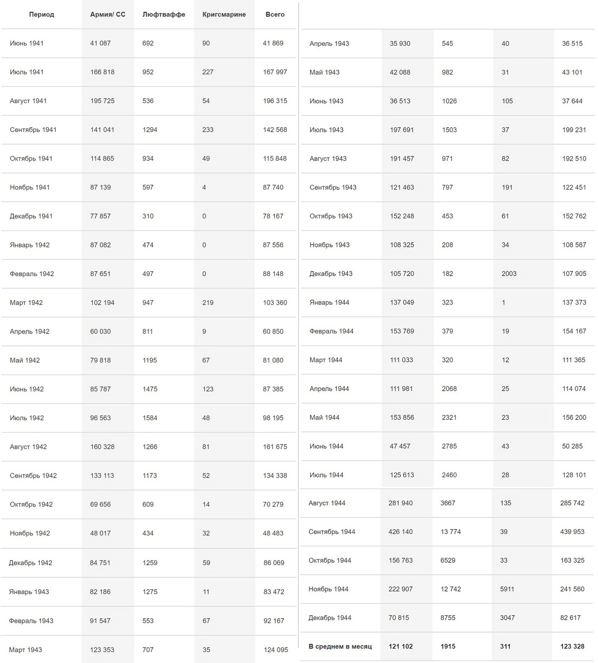 Отметим, что в начале войны одна дивизия насчитывала 15 000 человек, но со временем её штатный размер сократился на несколько тысяч. В приведённой таблице видно, что даже во времена сравнительного затишья потери редко опускались ниже 50 000 человек. Получается, что даже в самые спокойные периоды на Восточном фронте за месяц вермахт терял три полные дивизии. А в среднем потери составляли чуть более 120 000 человек в месяц, что примерно соответствует армии. В сентябре 1944 года потери достигли 439 953 человек, а это численность целой группы армий. Количество мужчин, достигших призывного возраста, в Германии составляло 400 000—500 000 в год, то есть в среднем за три-четыре месяца в горне войны «сгорал» целый год призывников.