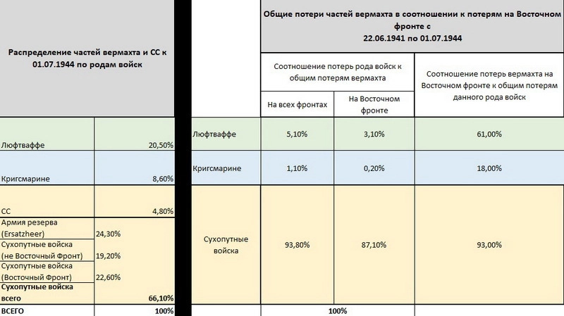 Указанные цифры верны лишь на 1 июля 1944 года. Во второй половине года на соотношение потерь повлияла высадка союзников в Нормандии, и Восточный фронт потерял несколько процентов.