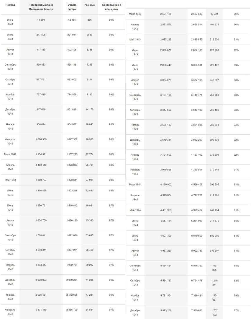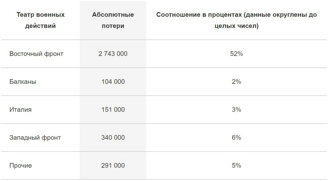 В таблице не учтены потери до нападения на СССР, но их количество — 50 000 солдат — минимально влияет на итоговые данные. Все приведённые данные — это кровавые потери, о которых говорилось в самом начале статьи.