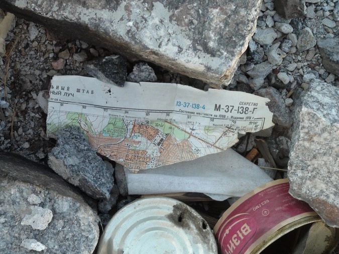 Рваная советская карта-генштабовка брошенная ВСУ-шниками и банка украинской консервы из армейского пайка. Верхушка Саур-могилы, фото сделал в день ее взятия ополчением. Наглядная иллюстрация к вышесказанному.