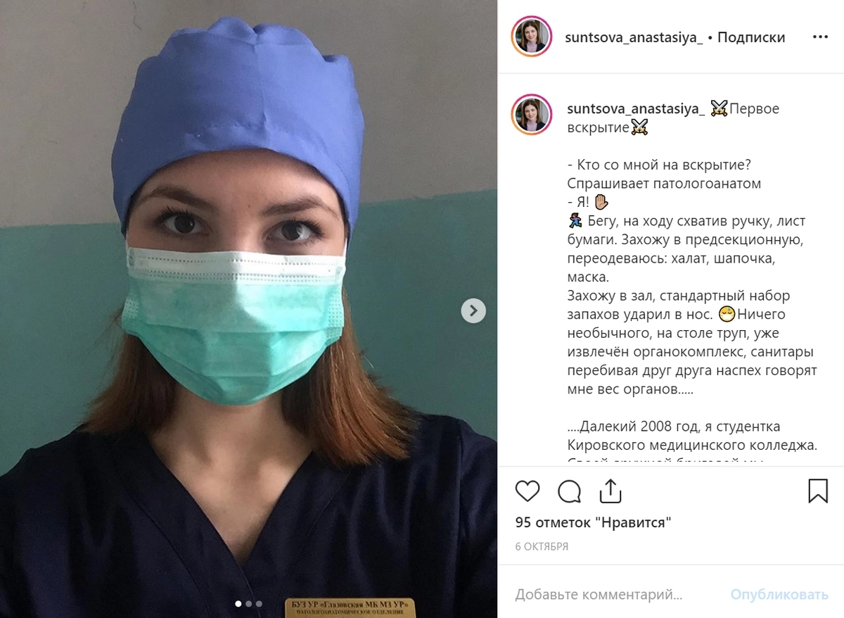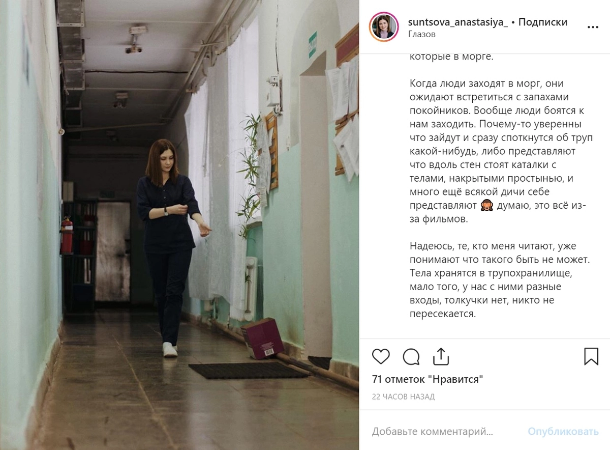 Как рассказала жительница Глазова Анастасия Сунцова в комментарии «Ридусу», посты о своей работе в морге начала публиковать в октябре, хотя подумывала об этом и раньше.