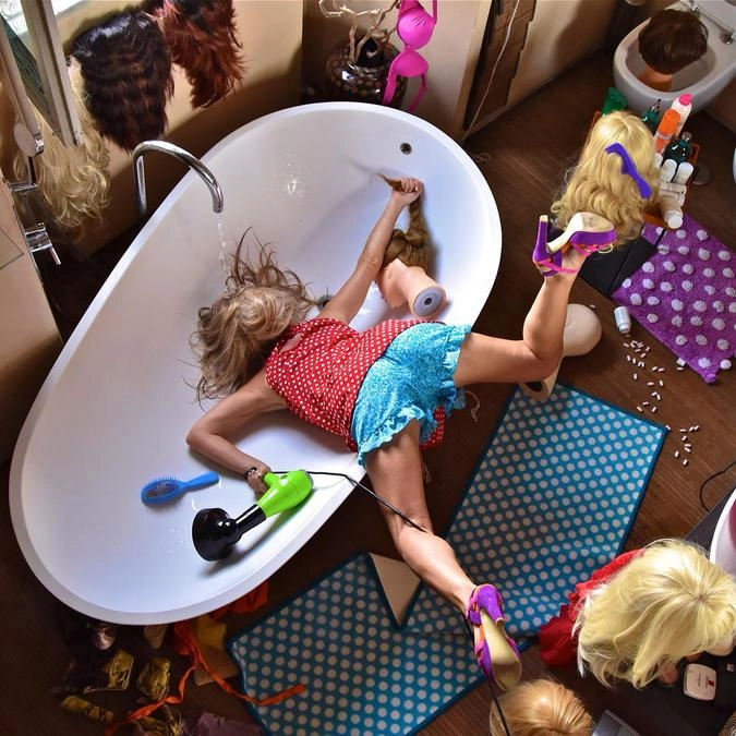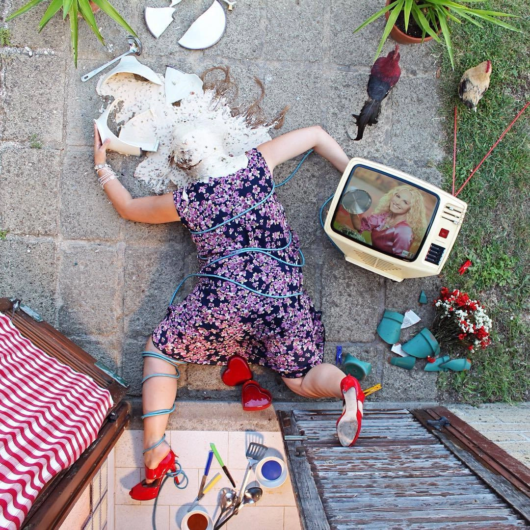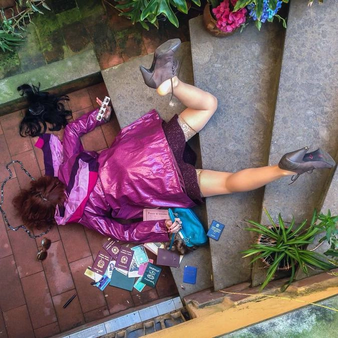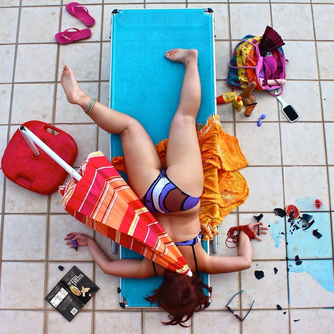 «Герои моих снимков достигли своего предела, они больше не могут притворяться. Каждый из них держит в руках какой-то объект, который не в силах выпустить из рук. Эта вещь — символ их фальшивой жизни. Я показываю трагедию через иронию», — говорит итальянский фотограф Сандро Джордано (Sandro Giordano), который создал необычный фотопроект «In Extremis (Bodies With No Regret)», который в русском варианте называется «Падение мира».