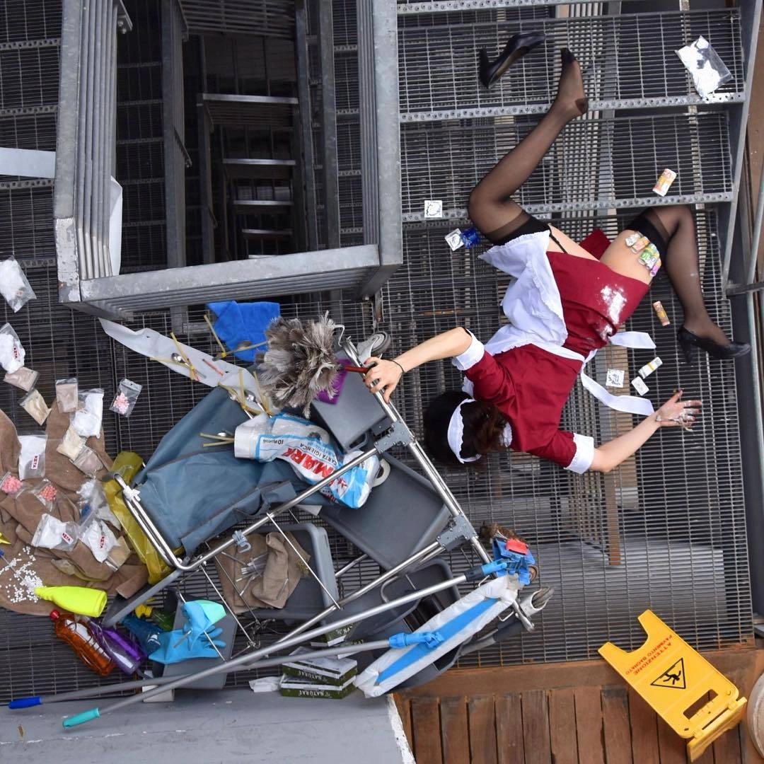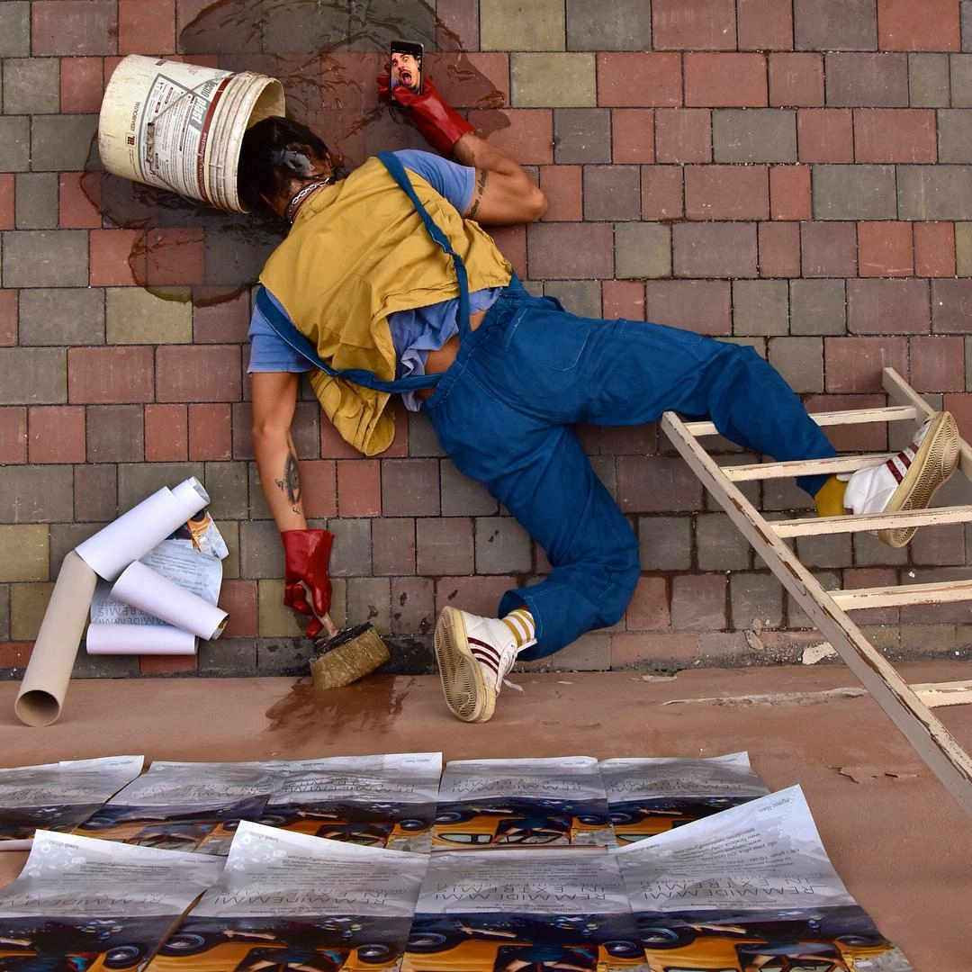 С помощью фотографий курьёзно и нелепо падающих людей автор показал пугающую тенденцию в современном мире, когда дорогие гаджеты, ненужная одежда и роскошные автомобили заменяют человечеству настоящие ценности — любовь, искренность, дружбу. Фальшь такой жизни можно увидеть в одежде персонажей фотосессии, их причёсках и даже в месте их падения.