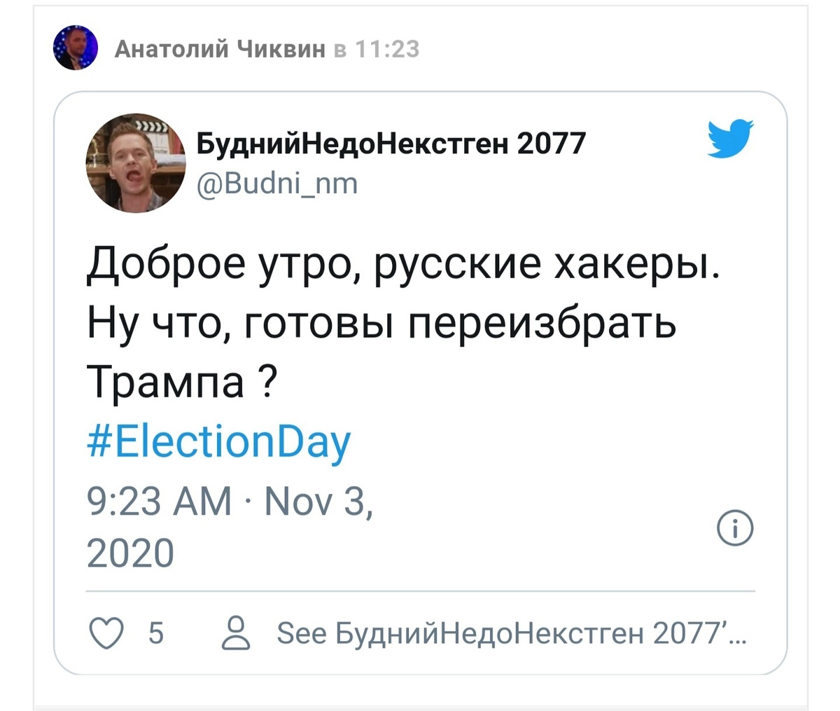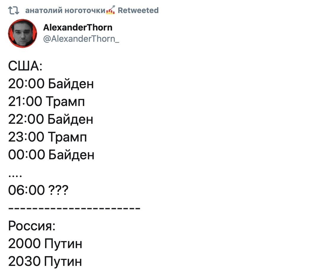 4 ноября весь мир затаил дыхание в ожидании подсчета голосов на американских выборах. Однако президентская гонка оказалась настолько напряжённой, что точные результаты будут известны, скорее всего, лишь завтра. А пока в соцсетях шутят на тему русских хакеров, сложных правил американских выборов и возраста кандидатов.