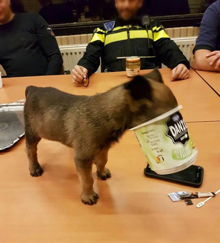 Этот щенок, служащий в полиции Голландии, застрял в упаковке из-под йогурта
