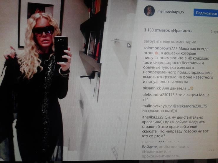 «Маша, извините, но вы сделали что-то страшное с лицом», «Что-то страшненькая стала», «ну вот что со ртом?», «Не надо больше пластику делать! Некрасиво! Они вас уродуют, за ваши же деньги», — отреагировали на снимок подписчики Малиновской.