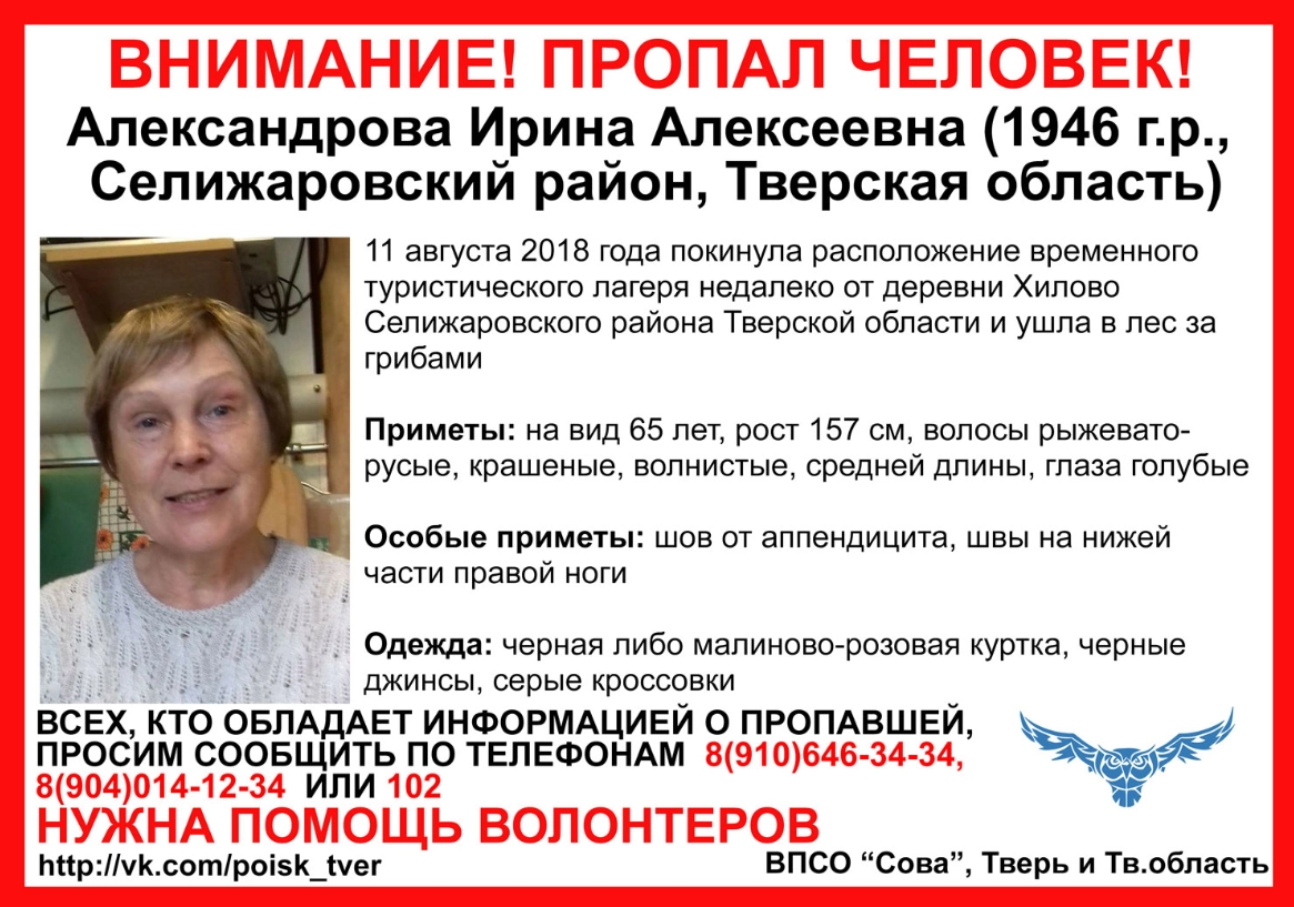 Как сообщили волонтеры поисково-спасательного отряда «Сова», 11 августа она ушла из туристического лагеря возле деревни Хилово Селижаровского района в лес собирать грибы. С тех пор о местонахождении Александровой неизвестно.