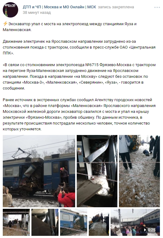 По сообщению пресс-службы ОАО «Центральная ППК», экскаватор упал на электропоезд № 6715 Фрязево — Москва. Движение электричек на Ярославском направлении затруднено.