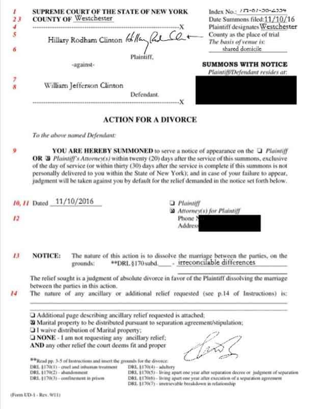 Издание Christian Times Newspaper опубликовало скан судебного иска о разводе, поданного адвокатами Хиллари Клинтон в Верховный суд округа Вестчестер штата Нью-Йорк.
