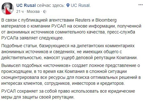 «Вымысел подобных «источников» создает ложное представление о происходящем, в то время как Компания в сложной ситуации сконцентрировала все ресурсы для поиска оптимальных решений в интересах клиентов, сотрудников, инвесторов и кредиторов, - говорится в сообщении компании в соцсети Facebook.