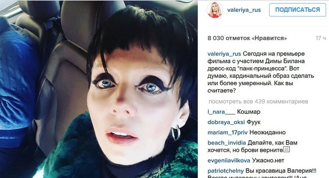 Певица Валерия ассоциируется у поклонников с трепетной блондинкой, этакой куклой Барби. Видимо, этот образ утомил звезду, поскольку на премьеру фильма «Герой», главную роль в котором сыграл Дима Билан, она пришла в неожиданном образе, кардинально отличающемся от привычного. В Instagram Валерия выложила фото в новом образе: короткие черные волосы, густо подведенные черным же глаза, высветленные брови и шуба едкого зеленого цвета.