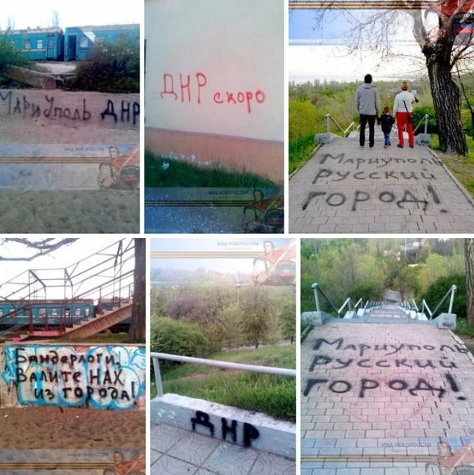 Содержательно граффити предсказывают скором переходе Мариуполя в состав ДНР, сам город назван русским, а украинским националистам предложено «валить».