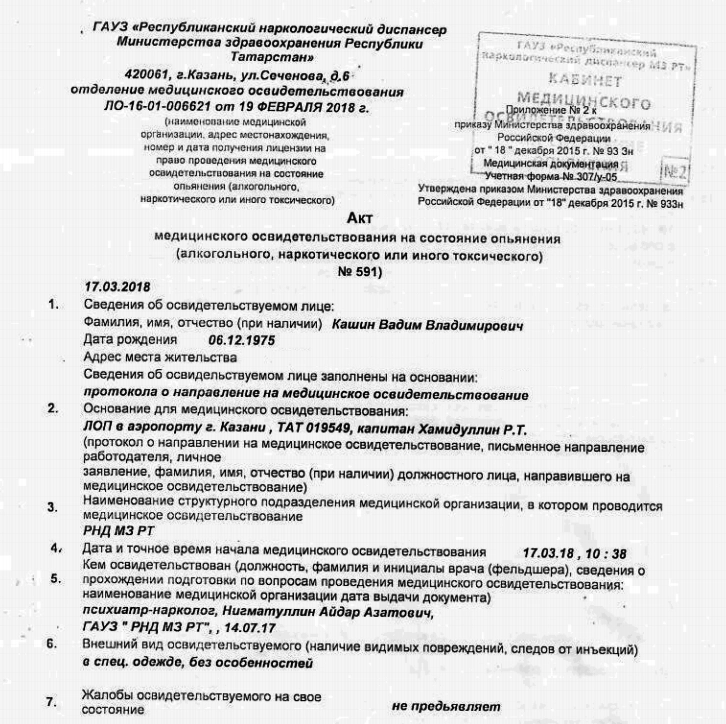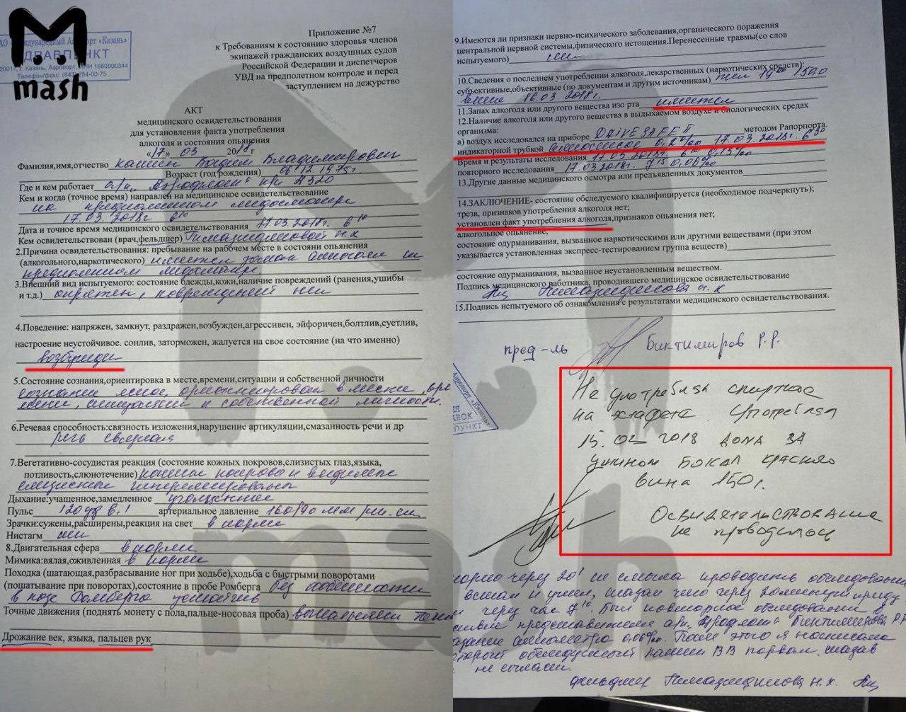 По данным Mash, речь идет о пилоте Вадиме Кашине. Медики зафиксировали у него в крови 0,2 промилле алкоголя. Летчик, который, вероятно, накануне употребил большое количество алкоголя, заявил, что и в таком состоянии сможет доставить пассажиров к месту назначения, но врачи не допустили его к полету.