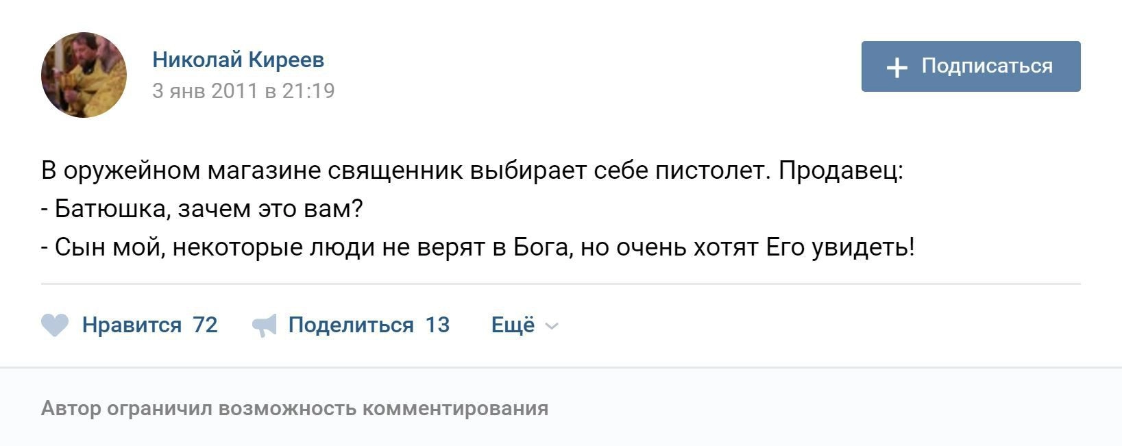 Судя по странице священнослужителя в социальных сетях, отец Николай отличается особым чувством юмора.