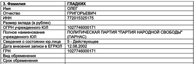 Согласно выписке из ЕГРЮЛ, учредителями ПАРНАС являются Александр Зябрев, Владимир Лысенко и Олег Гладких. Последний из этой «троицы» и вызвал повышенный интерес со стороны автора расследования: