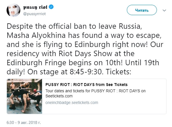 «Несмотря на официальный запрет покидать Россию, Мария Алехина смогла вылететь из страны и сейчас находится на пути в Эдинбург», — говорится в сообщении Pussy Riot в Twitter.