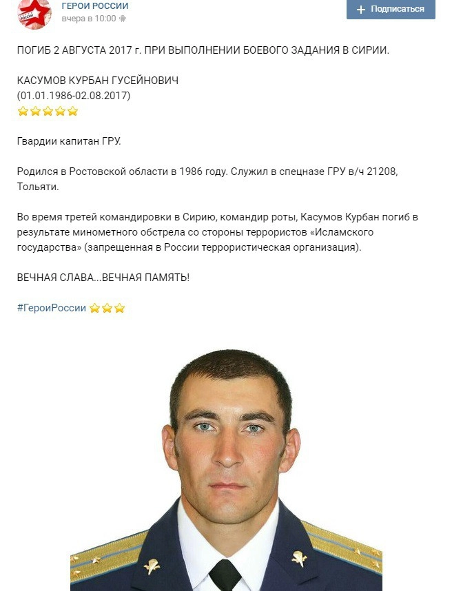 Курбан Касумов, капитан Главного разведывательного управления России, погиб в Сирии при выполнении боевого задания. Об этом сообщается в группе «Герои России» социальной сети «ВКонтакте».