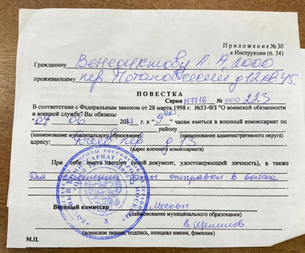 В военкомате Венедиктова-младшего ждали 4 июня, затем — 21 июня. И только спустя две недели после назначенной даты призывник прибыл для несения службы.