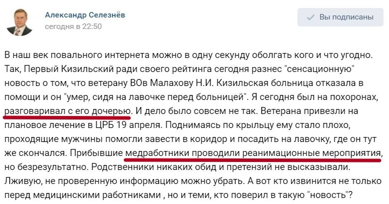 Позже главврач больницы Алла Васильева сообщила, что эта информация не соответствует действительности. По ее словам, на 19 апреля была назначена плановая госпитализация пенсионера. Родственники привезли его в больницу. Но когда мужчина поднимался по лестнице, ему стало плохо, он потерял сознание. Сотрудники учреждения занесли его в отделение, но уже не смогли помочь, пишет URA.RU.
