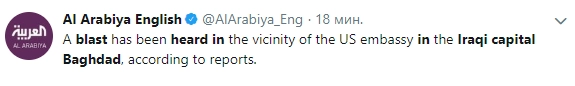 По данным Al Arabiya English, взрыв прогремел в непосредственной близости от посольства США в столице Ирака.