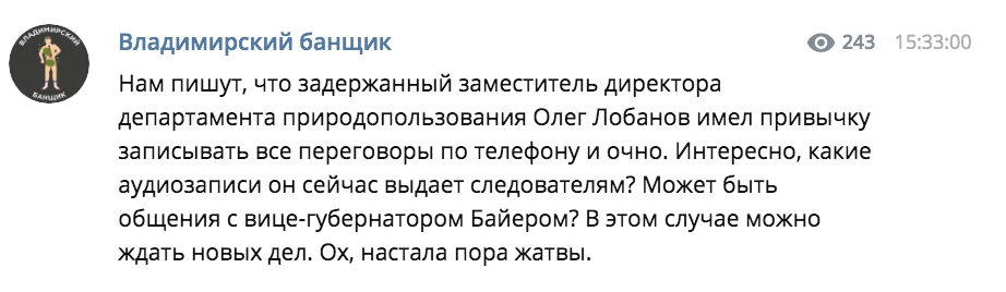 Олег Лобанов успел достаточно поработать куратором недропользователей нашей области, а значит может поведать следователям немало подробностей в рамках местных историй. Через Лобанова глава региона устанавливал свои правила карьерного бизнеса, убирал конкурирующие фирмы. Кажется, идет серьезная проработка серой схемы карьерного дела самого Сипягина, — пишут авторы телеграм-канала «Владимирский банщик».