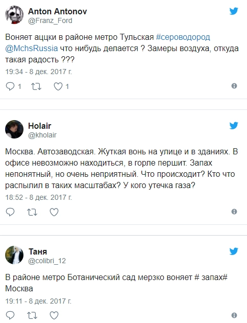 По имеющейся у телеканала информации, в «Мосгаз» сегодня поступило более 800 жалоб москвичей на плохой запах, многим напомнивший тухлую квашенную капусту. По словам некоторых из них, в городе стоял «адский запах».