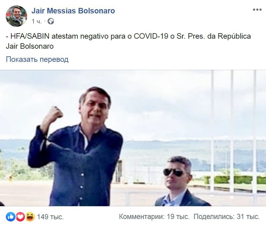 Президент Бразилии Жаир Болсонару заявил, что анализы не выявили у него коронавируса COVID-19, как о том ранее сообщили многие СМИ по всему миру.