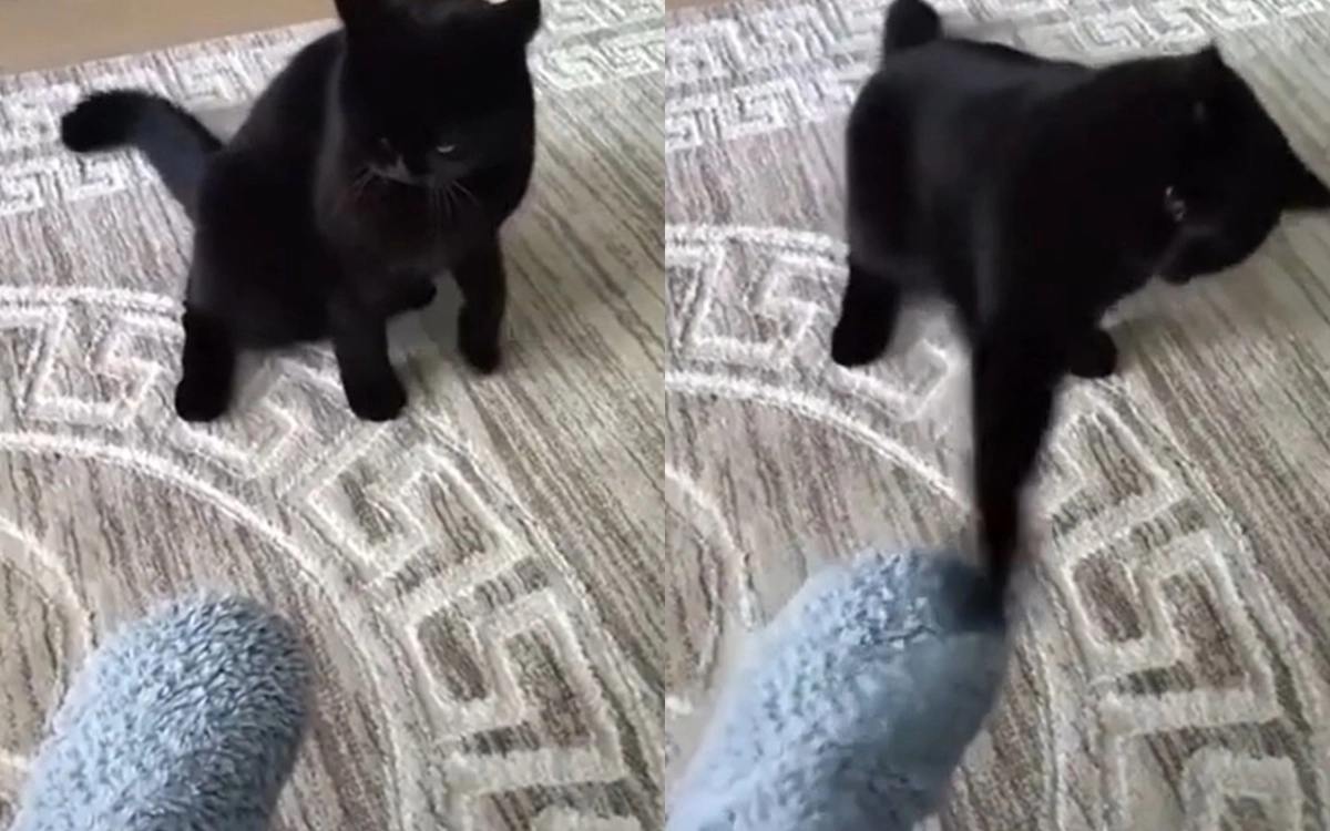 «Сними это немедленно»: кот не оценил новые теплые тапочки хозяйки