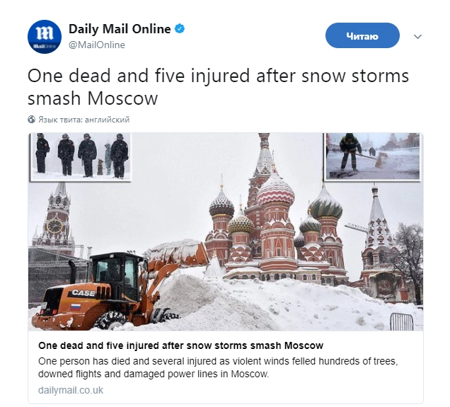 Британская газета Daily Mail опубликовала статью о мощном снегопаде в Москве. По данным издания, из-за непогоды погиб один человек и пятеро пострадали. На сайте размещены фотографии москвичей и туристов, которые выгуливают собаки и делают селфи в снегопад.