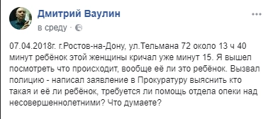 Житель Ростова-на-Дону Дмитрий Ваулин снял на видео прогулку многодетной мамы с тремя детьми. Мужчину возмутило, что мальчик кричал в течение 15 минут и она не могла его успокоить. Пользователь опубликовал видео на своей странице в Facebook.