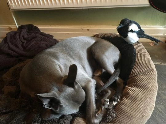 Английский художник Стив Рострон (Steve Rostron) поделился трогательной историей о необычной дружбе своих питомцев. Четыре месяца назад мужчина гулял со своей гончей по кличке Бу Рэдли (Boo Radley), когда пёс нашёл за телефонной будкой раненого сорочонка. Стив забрал птичку домой и ухаживал за ней, однако когда птенец поправился, то отказался улетать на свободу.