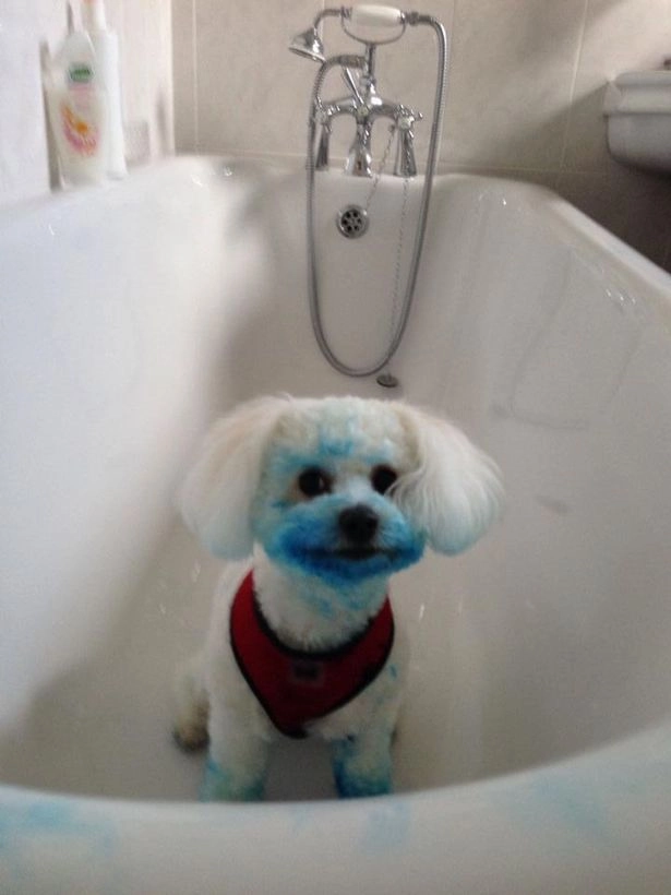 Девушка заперла собаку в ванной и позвонила мужу, чтобы тот скорее отвез Рози к грумерам. В салоне помогли постоянной клиентке и состригли синюю шерсть, а вот когти питомицы еще долго были окрашены в модный цвет.