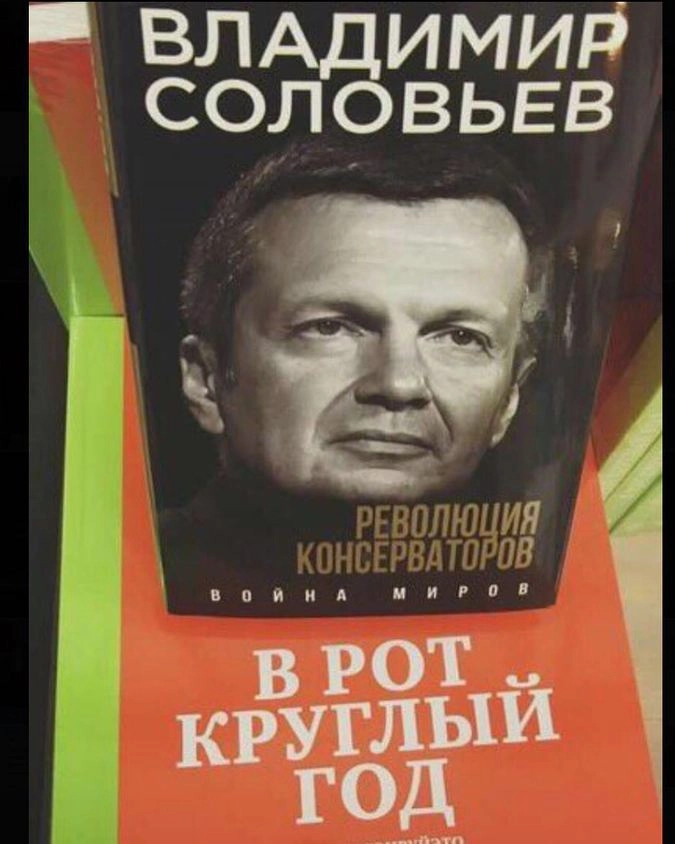 Для этого Собчак поделилась снимком, на котором книга Соловьева «Революция консерваторов. Война миров» соседствует рядом с изданием «В рот круглый год».