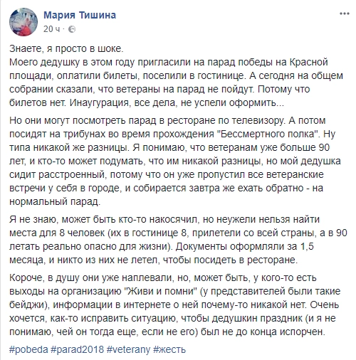 «Я понимаю, что ветеранам уже больше 90 лет, и кто-то может подумать, что им никакой разницы, но мой дедушка сидит расстроенный, потому что он уже пропустил все ветеранские встречи у себя в городе, и собирается завтра же ехать обратно — на нормальный парад. Я не знаю, может быть, кто-то накосячил, но неужели нельзя найти места для 8 человек (их в гостинице 8, прилетели со всей страны, а в 90 летать реально опасно для жизни). Документы оформляли за 1,5 месяца, и никто из них не летел, чтобы посидеть в ресторане», — написала Тишина.